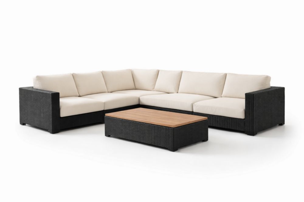 Outdoor Rattan L-Shaped Sectional Sofa Set with Beige Cushions and Wood Coffee Table