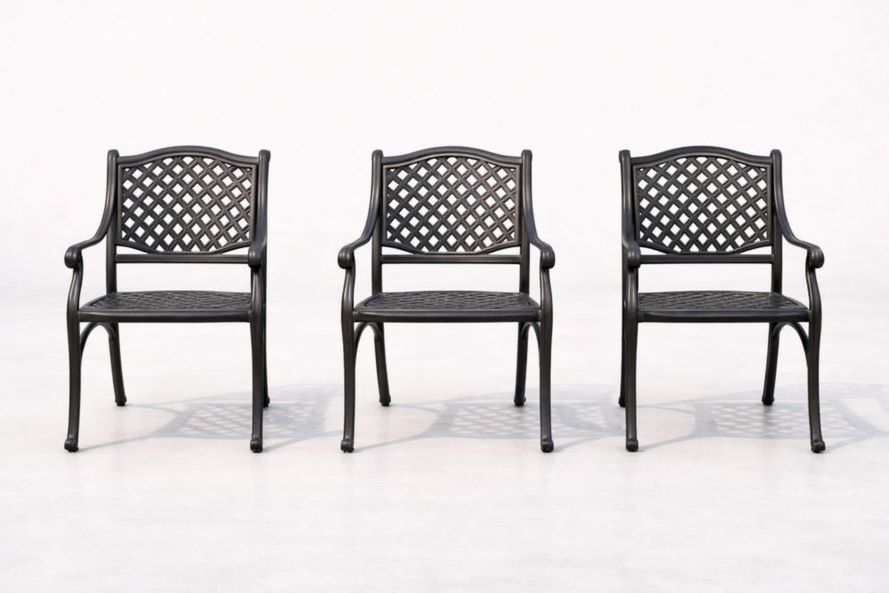 Set of 3 Cast Aluminum Outdoor Armchairs with Lattice Design in Black